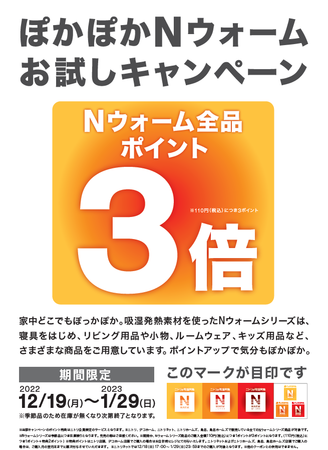 【ニトリ】ニトリポイントが 3 倍! 冬本番の今だから、「ぽかぽか N ウォームお試しキャンペーン」が、12 月 19 日(月)からスタート