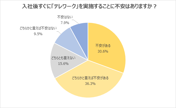 入社後すぐに「テレワーク」を実施することに「不安がある」と回答した新社会人が30.6%に上りました。「どちらかと言えば不安がある」36.3%と合わせると、約7割の新社会人が「入社後すぐのテレワーク」に不安を覚えていることが分かります。「テレワークだと業務の進め方があっているか分からない」「分からないことがあったときに、質問や相談をしにくいと思う」「出社して対面で話したほうが、職場の雰囲気に早く慣れることができると思う」「Web面接やオンライン授業は多く経験してきたが、面接や授業と仕事は異なると思う」といった声が上がりました。