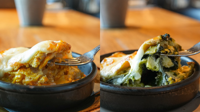 1つは「南部一郎かぼちゃのラザニア」。南部一郎かぼちゃは、希少な鶴首かぼちゃがベースの岩手県のオリジナル品種で、化学肥料は一切使用していないのが特徴です。糖度は通常のかぼちゃは10~12度ですが、南部一郎かぼちゃは15度が出荷条件で、マンゴーに匹敵する甘さが特徴です。もう1つは「ほうれん草とバジルペーストのラザニア」です。茨城県にある契約農家の有機ほうれん草をさっとボイルし、風味を生かす工夫をしています。どちらも水牛ミルク100%のモッツァレラチーズとベシャメルソースを使用し、クリーミーで濃厚な味わいを楽しむことができます。