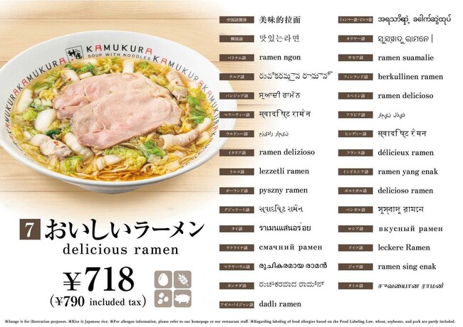 急増する外国人旅行客にどうとんぼり神座を楽しんでもらうために制作した本メニューは、定番メニューの「おいしいラーメン」を、31ヵ国語で表記しています。