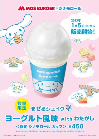 モスバーガーを展開する株式会社モスフードサービス(代表取締役社長:中村 栄輔、本社:東京都品川区)では、2023年1月5日(木)~2023年2月上旬まで、全国のモスバーガー店舗(一部店舗除く)にて、「まぜるシェイク ヨーグルト風味 with わたがし<限定 シナモロール カップ>」を30万食限定、期間限定で新発売します。