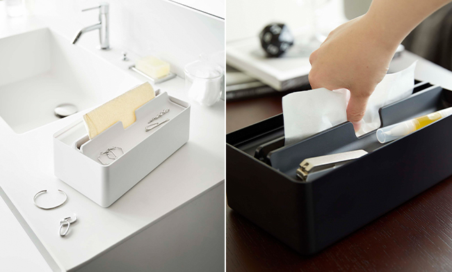 蓋にアクセサリーなど、小物の一時置きができる便利なトレー付きのペーパータオルケース。