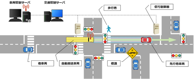 ・ 交通管制サーバは、自動搬送車両の走行状況に応じて信号機などを制御するとともに、車両管制サーバに対し進行・停止を指示することで、交差点や横断歩道の交通整理を行い、自動搬送車両の安全かつスムーズな走行を実現します。