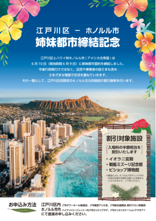 株式会社JTB(以下「JTB」)は、東京都江戸川区(以下「江戸川区」)と連携し、江戸川区とアメリカ合衆国ハワイ州ホノルル市(以下「ホノルル市」)の姉妹都市盟約締結を記念する取り組みとして、江戸川区民が JTB の対象店舗にてホノルル市の文化的施設を訪問するオプショナルツアー及び入館チケット(以下「対象商品」)を購入する際に割引が受けられる事業を、12月1日より開始いたしました。
