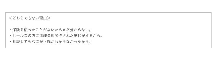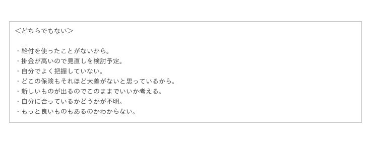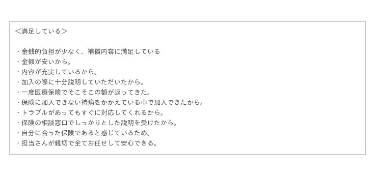 見直しをしてみたけれど、今ひとつ満足感を得られていない理由としては、保険料が思ったほど下がらなかったことに加え、内容が本当にそれでいいのか、腑に落ちていないという意見が見られました。