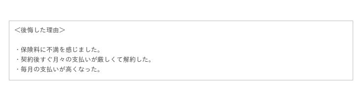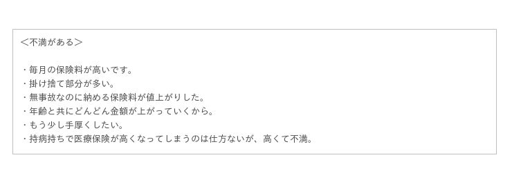 若い頃に加入して一度も見直していない人は、保障内容は変わらないのに年齢とともに上がっていく保険料に不満を感じているようです。