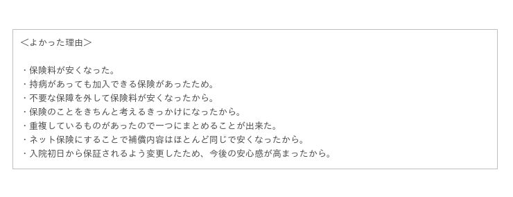 また、最初の保険は親のすすめなどであまり考えずに入った人が多いせいか、見直したことによって、保険としっかり向き合うきっかけになったという意見も多く見られました。