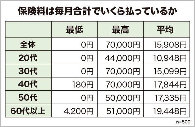 最低額は0円なので、まだ保険に加入していない人も少なくないようです。20代~30代はまだ一度も保険に加入したことがない人もいると思われますが、50代の0円は保険が不要になって加入をやめた人も含まれているかもしれません。