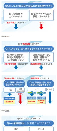 フローチャートで質問に答えていくと、たくさんある生命保険・医療保険の種類の名前と、それぞれの違いがわかるようになっています。