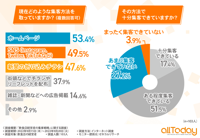 【オールトゥデイ|調査レポート】飲食店経営者の集客方法が明らかに。3割以上の経営者今の集客方法が十分に集客できていないと回答