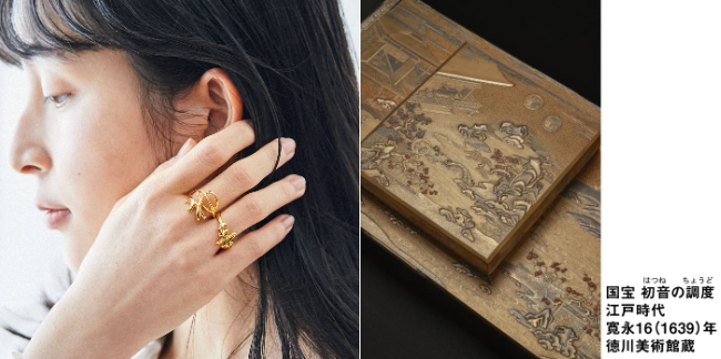 尾張徳川家に伝わる調度品、国宝「初音の調度」に細工された「初」「音」「鶯」の意匠をそれぞれ立体化した緻密なデザインの指輪です。婚礼調度のデザインには、和歌が隠されており、指輪を身に着けていると、明石の君の娘への想いが聞こえてきそうです。