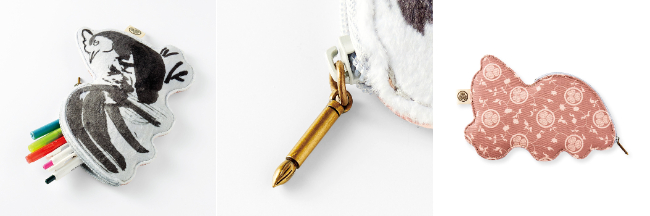 ペンなどの小物を持ち運べる大きさで、チャームパーツが和筆になっているのもポイントです。裏面は葵の御紋のパターンで、実際の掛け軸に使われている布地の意匠をイメージしています。