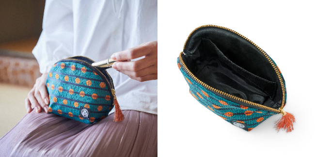 尾張徳川家に守り継がれてきた鎧兜(よろいかぶと)「具足(ぐそく)」の意匠を、ふだん使いしやすいデザインに落とし込んだラウンドフォルムのおしゃれなポーチです。西陣織の職人の手でていねいに織り込まれた立体感のある仕上がりや、武将が戦の際にふるっていた「采配(さいはい)」に見立てたタッセル、葵の御紋がプリントされたデザインタグなど、細部へのこだわりが感じられます。底まちがあるので収納力も抜群です。コスメアイテムや、モバイルアイテムを入れて持ち運ぶのにちょうどいいサイズで、中には仕分けに便利な内ポケットも付いています。