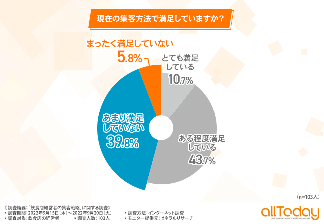 【オールトゥデイ|調査レポート】半数近くの飲食店経営者が今の集客方法に不満を抱えている?その理由として費用対効果や工数対効果が挙げられる