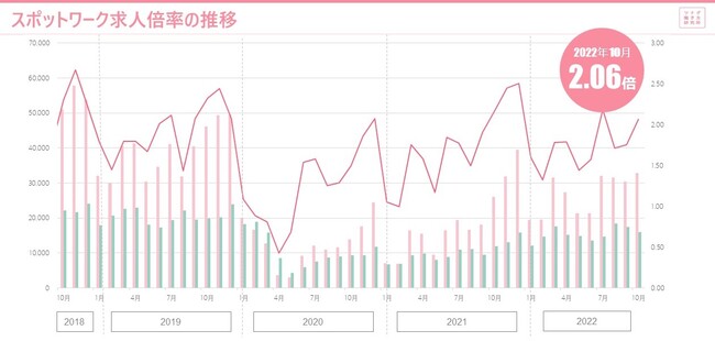 1.単発、短時間、短期間で働くスポットワークの2022年10月度求人倍率は2.06倍