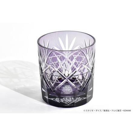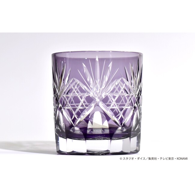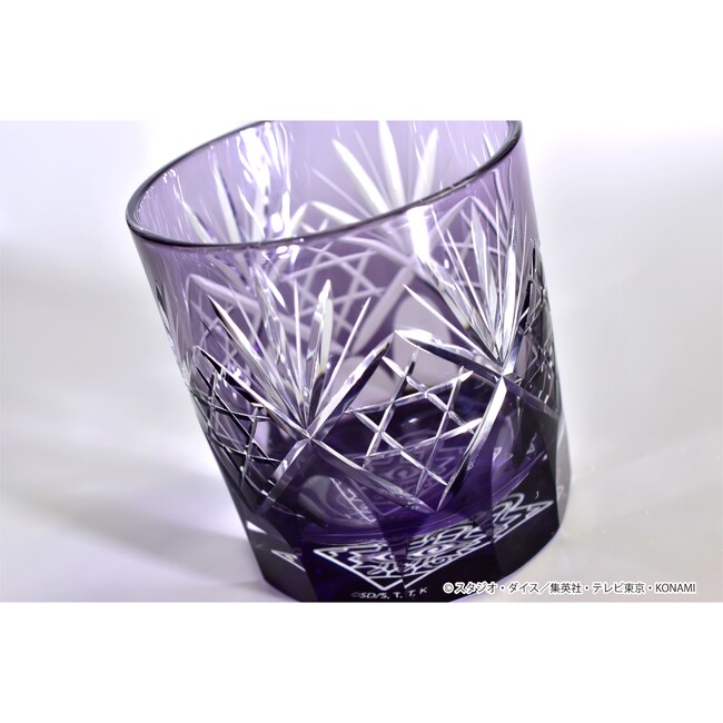 「闇遊戯モデル」は古代紫カラーのガラスを、「海馬瀬人モデル」は青藍カラーのガラスを使用。匠の技から生み出された美しい緻密なカットが煌めく、2種類の江戸切子グラスです。