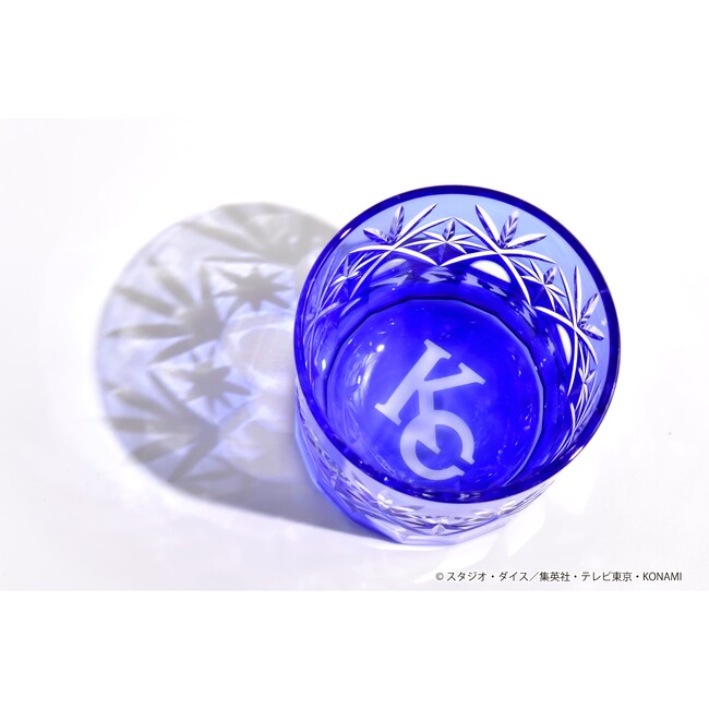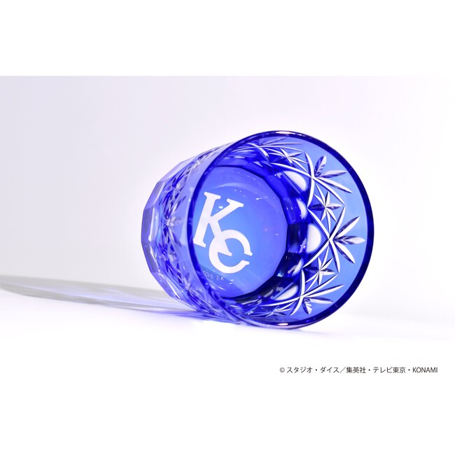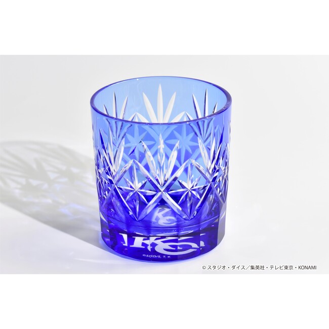 光を透過して煌めく美しい文様は、大変な手間と高い技術の賜物。職人たちがひとつひとつ手作業で彫り、磨きあげた伝統模様が輝くグラスの底には、闇遊戯&海馬瀬人を語る上で欠かせない“千年パズル”と“KC(海馬コーポレーション)”のロゴマークが刻まれています。