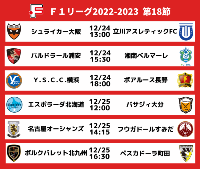12月24日(土)、25日(日)にFリーグ2022-2023 ディビジョン1 第18節の6試合を開催いたします。