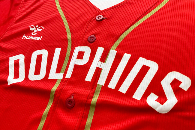 ベースボールシャツのデザインは、今シーズンのHOMEユニフォームをベースに、胸に「DOLPHINS」とシンプルに入れ、エンブレムはあえて裾部に小さく配置。厚みのあるしっかりとした生地を採用。ドルフィンズレッドにゴールドのパイピングで、名古屋らしさを主張する一枚に仕上げました。