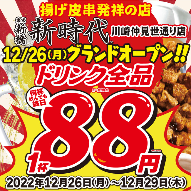 「新時代 川崎仲見世通り店」のオープンを記念し、ドリンク全品を1杯88円(税込97円)でお楽しみ頂けるキャンペーンを開催します。