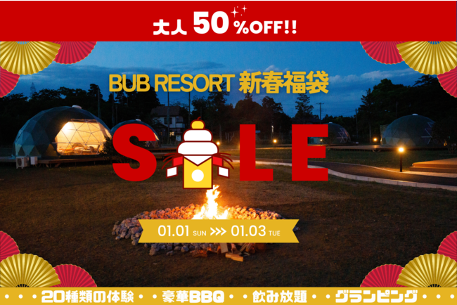株式会社BUB(東京都品川区、代表取締役 一戸 悠人)が運営するBUB RESORT Chosei Village(千葉県長生郡)で元旦の朝から三日間限定で、料金が半額(子供料金除く)となる福袋プランを販売いたします。2023年1月1日~3日の期間中に、対象期間(1月11日~2月28日)のご予約いただいた方が対象となります。