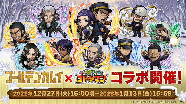 株式会社MIXI(東京都渋谷区、代表取締役社長:木村 弘毅)は、スマホアプリの「ことば」で闘う新感覚RPG「共闘ことばRPGコトダマン」(以下コトダマン)において、TVアニメ『ゴールデンカムイ』との初コラボを、本年12月27日(火)より開催します。