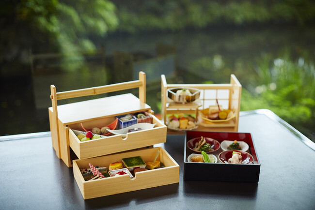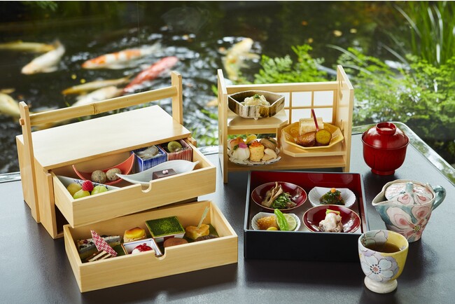 また、「和食アフタヌーンティー」では、季節の素材を吟味し、丁寧に仕込んだ職人の技が光る品々を、毎月献立を変更してご用意いたします。開ける瞬間の期待感をお楽しみいただけるよう黒いお重でご提供する口取りには、1月はサクサクの衣とぷりぷりの食感を堪能できるふぐ香り揚げや数の子粉節和えなどをご用意。鰊の旨みを引き出しながら丁寧に煮込んだ焚合せや、甘辛く仕上げた銀むつの煮焼き、旨みあふれる出汁巻サンドなどの焼物など、季節感を演出する華やかなお料理を揃えます。