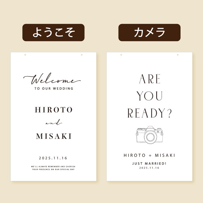 その際に可愛い写真が撮れるように準備したウェディングフラッグは、2デザインから選べるので挙式の雰囲気に合う方をお選びください。