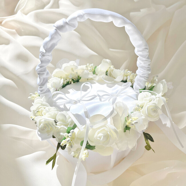 カゴ型のリングピローはお子様でも持ちやすく、指輪はリボンでしっかりと固定できるタイプなので小さなお子様にお願いするときでも安心です。