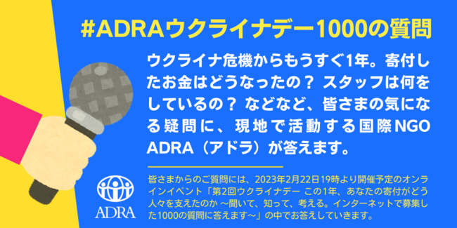 このイベントに先駆け、本日より、上記イベント開催に向け、ウクライナの現状や活動内容などの質問を募集いたします。気になることがある方はどなたでも、インターネットのアンケートかSNSで「#ADRAウクライナデー1000の質問」のハッシュタグをつけることで応募できます。皆さまからのご質問はイベント開催当日、幣団体スタッフよりお答えします。