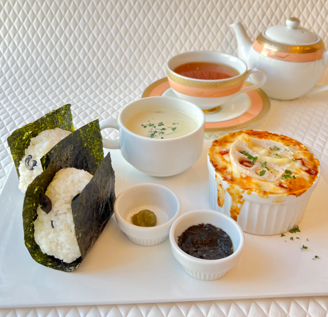佐賀県とアマンドを食で結ぶ、お結びプレート。甘み豊かでもっちりとした「さがびより」を黒オリーブ、アンチョビと一緒に炊き上げ、口どけのよい旨みが豊富な佐賀海苔で包んだお結び、ホクホクの食感が楽しい熱々のマカロニグラタンのセット。この時期にうれしい甘みたっぷりな白石町産玉ねぎと豆乳のスープを添えた佐賀を味わうワンプレートです♪