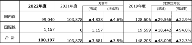 集計期間の始めと終わりの旅客数が低調に推移したことが主な要因となり、昨年度の実績をやや下回った。一方、3年ぶりに行動制限のない年末年始になったこと、約2年9か月ぶりとなる国際線チャーター便が運航されたことにより、コアとなる12月28日~1月3日では昨年度の実績を上回った。国内線におけるコロナ禍前2019年度の比較では、8割弱の水準まで回復した。