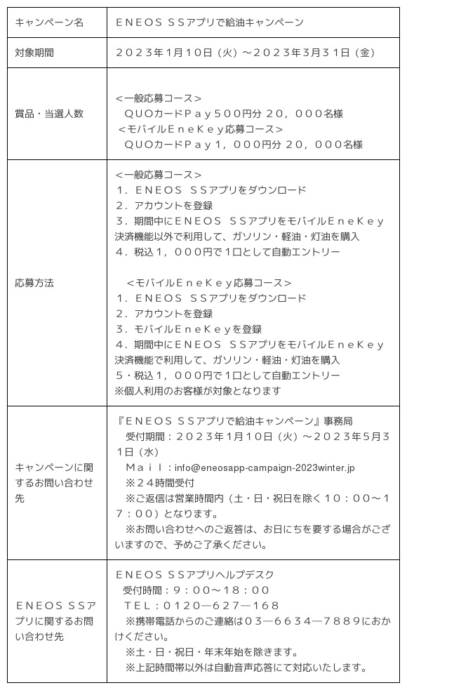 本キャンペーンでは、期間中、ENEOS SSアプリの機能の一つであるモバイルEneKey※1決済を使用してガソリン・軽油・灯油を給油いただいたお客様に対して、抽選で20,000名様にQUOカードPay1,000円分をプレゼントいたします。また、モバイルEneKey決済以外のENEOS SSアプリの機能(クーポン利用や給油設定※2など)を使用してガソリン・軽油・灯油を購入いただいたお客様に対しては、抽選で20,000名様にQUOカードPay500円分をプレゼントいたします。