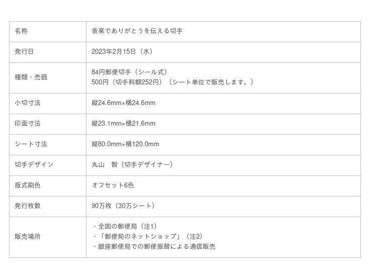 日本郵便株式会社(東京都千代田区、代表取締役社長 衣川 和秀/以下「日本郵便」)は、さまざまな感謝の思いを伝えるお手紙にご利用いただけるよう、グリーティング切手「音楽でありがとうを伝える切手」を発行します。