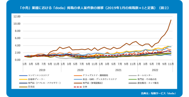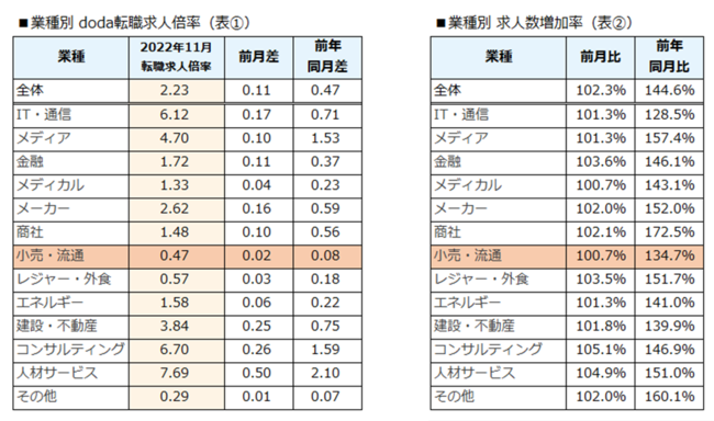 パーソルキャリア株式会社が運営する、転職サービス「doda(デューダ)」(編集長:大浦 征也)は、2022年11月の小売・流通業界の転職求人倍率をまとめた「業界版doda転職求人倍率」を発表いたします。