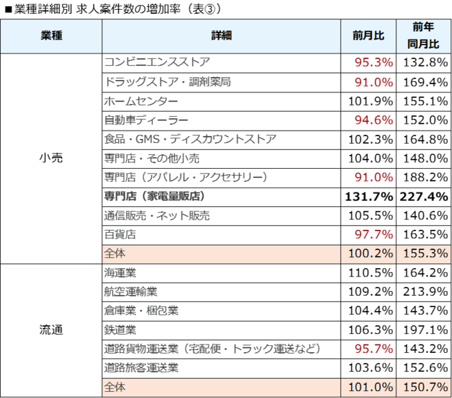 専門店(家電量販店)の求人案件数は2022年6月ごろから大きく伸びており、2022年11月は、前年同月比で227.4%になりました(図2.、表3.)。その背景には、大きく2つの要因が挙げられます。