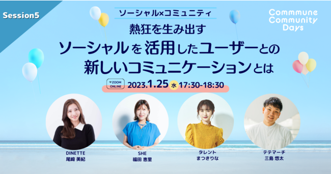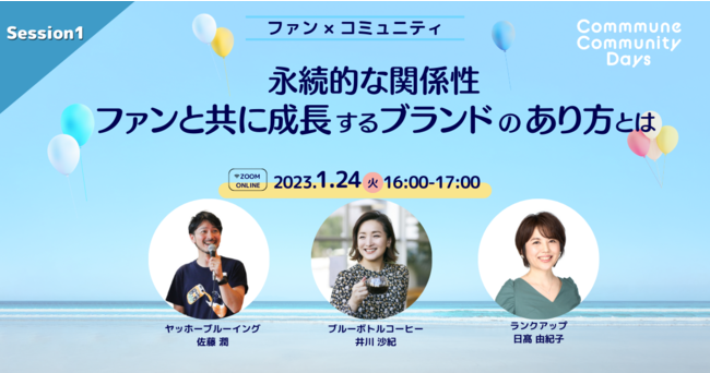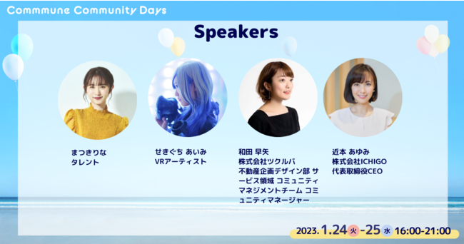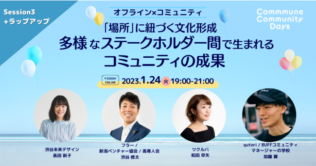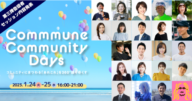 コミューン株式会社(本社:東京都品川区、代表取締役CEO:高田優哉)は、2023年1月24日(火)・25日(水)に開催するコミュニティに関わる全ての方に向けた無料オンラインカンファレンス「Commmune Community Days ~コミュニティにまつわる『あれこれ』を360°語り尽くす~」の第三弾ご登壇者とセッション一覧についてお知らせします。各業界のキーパーソンを招聘し、完全無料で開催させていただきます。また、参加者限定のオフライン交流会も後日実施しますので、皆様お誘い合わせの上ご参加をお待ちしております。