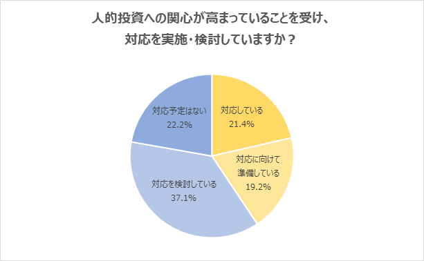 人的投資への関心が高まっていることを受け、対応している企業は21.4%。約6割の企業が対応を準備・検討中。「若い世代を中心に、スキルアップの機会を重視する人が増えている」の声/人事担当者アンケート
