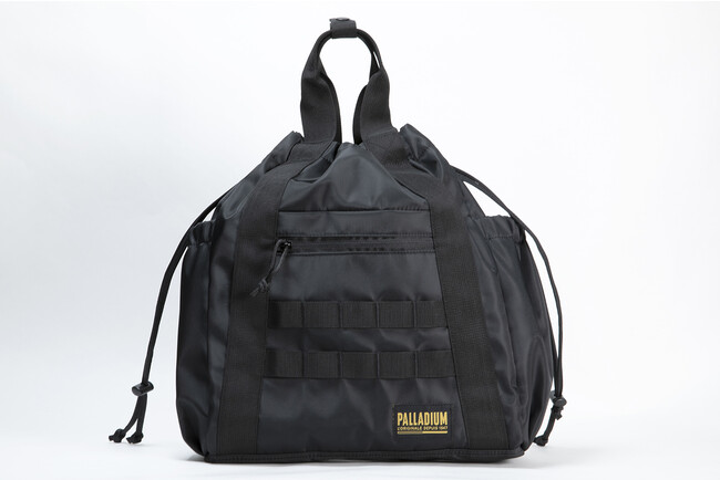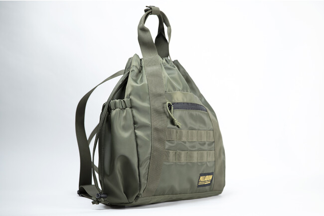 丸みのある巾着型のナイロントートバッグ。リュックにもなる便利な2WAYタイプで、2本のウェビング(帯)によりミリタリー調に仕上げています。