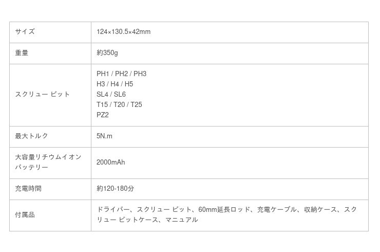 12種の高品質S2スクリュー ビット/大容量バッテリー/5N.mの最大トルク/ネジ穴を照らすLEDライト