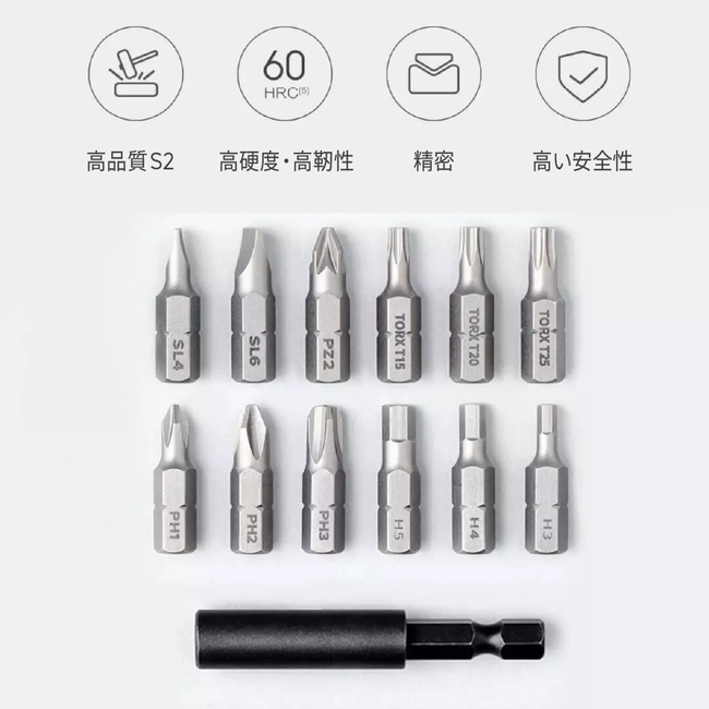 様々な用途に対応できるよう12種の高品質S2スクリュー ビットが付いております。