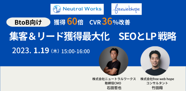 株式会社ニュートラルワークス(神奈川県茅ヶ崎市 代表取締役:三木五月、以下 ニュートラルワークス)は、メディアプロモーション事業を手がける株式会社free web hope(東京都千代田区 代表取締役:相原ゆうき)と共催でオンライン無料セミナーを開催いたします。