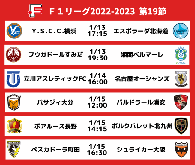 1月13日(金)~15日(日)にFリーグ2022-2023 ディビジョン1 第19節の6試合を開催いたします。