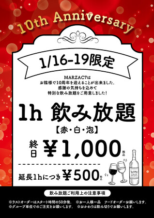 MARZAC7ご来店のお客様を対象に、2023年1月16日(月)から1月19日(木)の4日間限定でワイン飲み放題を特別価格1000円/h(税込)で提供します。