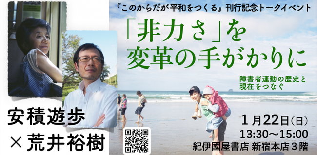 『このからだが平和をつくる――ケアから始まる変革』は、車いす利用者として果敢に街に出ることで「障害者が当たり前に街で暮らせる」社会をつくってきた安積遊歩氏が、その半生を振り返り執筆した本です。2022年12月15日に、大月書店から刊行されたことを記念し、障害者運動の経験と文学をつなぐ著作で注目される荒井裕樹氏(二松学舎大学文学部准教授)との対談を企画いたしました。