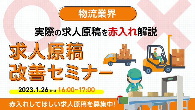 企業のオウンドメディアリクルーティングを支援する株式会社天職市場(本社:東京都新宿区西新宿、代表取締役:春名 敬太)は、2023年1月26日(木) に社員採用担当者向けオンラインセミナー『実際の求人原稿を赤入れ解説【物流業界】求人原稿改善セミナー』を開催いたします。