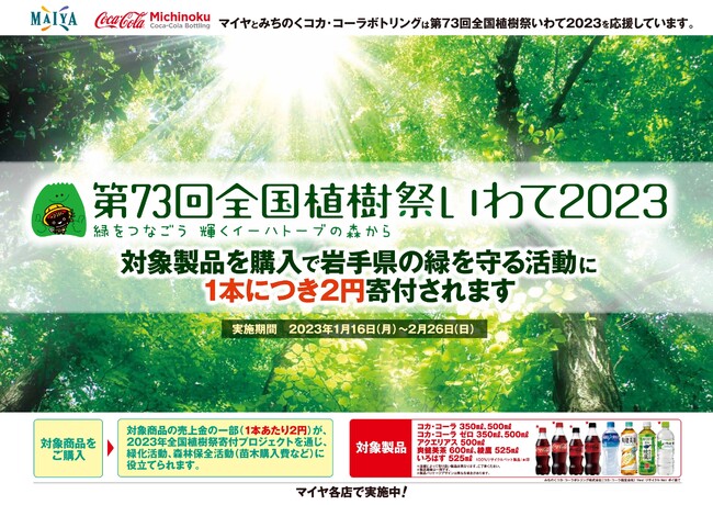 みちのくコカ・コーラボトリング株式会社(本社: 岩手県盛岡市、代表取締役社長: 谷村広和)は、株式会社マイヤ(本社: 岩手県大船渡市、代表取締役社長: 伊原良幸)と協働し、対象製品の売上の一部を岩手県の緑を守る活動に寄付するプロジェクトを、1月16日(月)からマイヤ各店の店頭キャンペーンとして実施いたします。