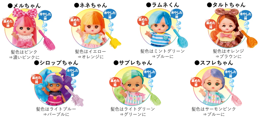 従来のメルちゃんシリーズ同様に、パイロットコーポレーション独自のメタモヘアを使用しており、氷水(15℃以下)で髪の毛の色が変化します。髪の毛全体の色を変えたり、一部だけ模様をつけたりオリジナルのヘアアレンジが楽しめます。部屋の中やお風呂ではもちろん、小さいのでポケットやバッグに入れて、お外に連れて行って一緒に遊ぶことも出来ます。