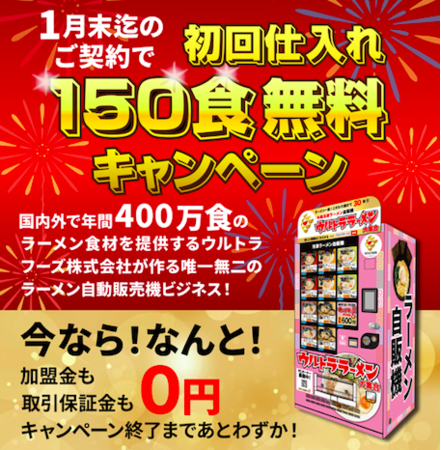 【ウルトララーメン大集合】 ラーメン自販機のオーナー募集『ご好評につき期間延長!』【1月31日までにご契約のお客様限定】 初回仕入れ分のラーメン150食 無料プレゼントキャンペーン開催中