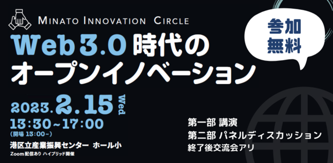 港区立産業振興センター(所在地:東京都港区)では、2月15日に「"MINATO Innovation Circle" Web3.0時代のオープンイノベーション」をハイブリッド開催いたします。Web3.0基礎知識やビジネス事例の講演・Web3.0スタートアップのパネルディスカッションを通して、Web3.0ビジネスの強み・企業間連携による共創の可能性などを考えます。また、終了後は交流会(※)を行い、来場者と事業者間の新たなビジネス連携のきっかけを創出します。※会場参加のみ